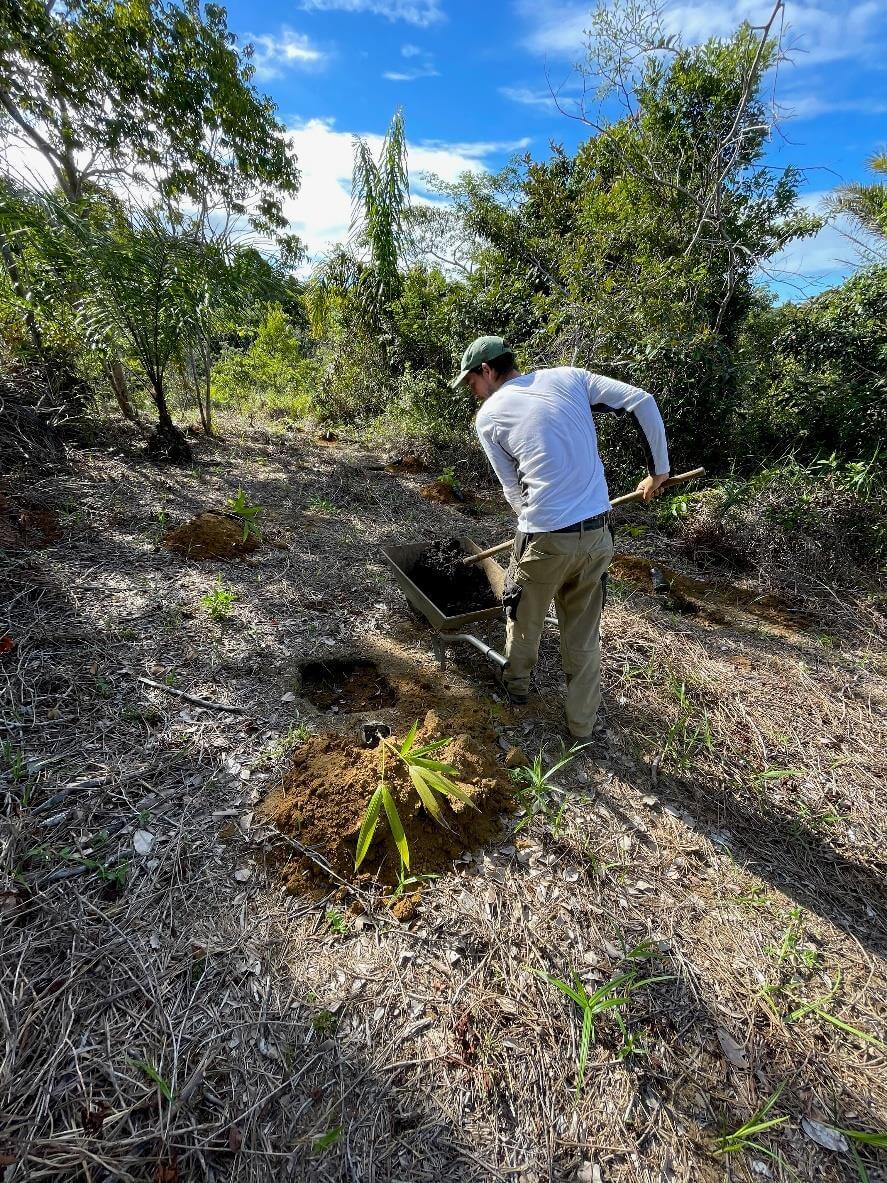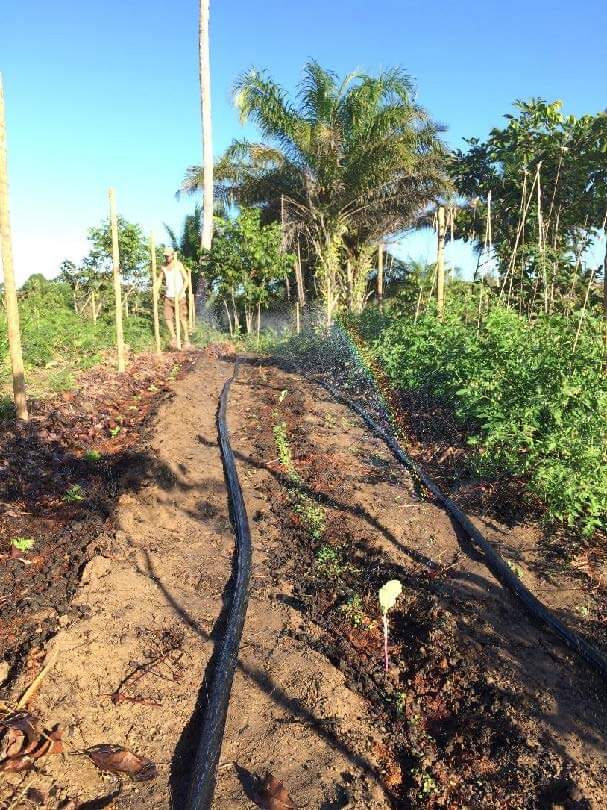 In der eigenen Baumschule wurden die Setzlinge herangezogen. Neben Kakao und Açaí wurden auch Cupuaçu und Pfeffer gepflanzt, um für noch mehr Artenvielfalt zu sorgen. Parallel musste der Boden vorbereitet werden. Nach einer Bodenanalyse wurde festgestellt, dass der Boden noch sehr „ausgelaugt“ ist. Daher wurden 3,5 Tonnen Kalksteinpulver und Agrargips ausgebracht sowie 10 Tonnen Kuhdung und 1,5 Tonnen Gesteinsmehl zur Düngung verwendet. Hierdurch wird der pH-Wert des Bodens korrigiert. Nach Ausheben der Löcher im Mai wurde im Juni damit begonnen, die Kakao- und Cupuaçúsetzlinge zu pflanzen. Im Juli folgten dann die Açaípalmen und im August Pfeffer gemeinsam mit Glyricidia-Stecken. Das sind Stickstoff bindende Bäume, an denen der Pfeffer ranken kann. Parallel zu den Pflanzaktivitäten musste der bereits bestehende junge Agroforst beständig gedüngt, von Unkraut befreit und zurückgeschnitten werden. Nur deshalb baut dieser so viel schneller eine Humusschicht auf, als das durch natürliche Prozesse der Fall wäre.